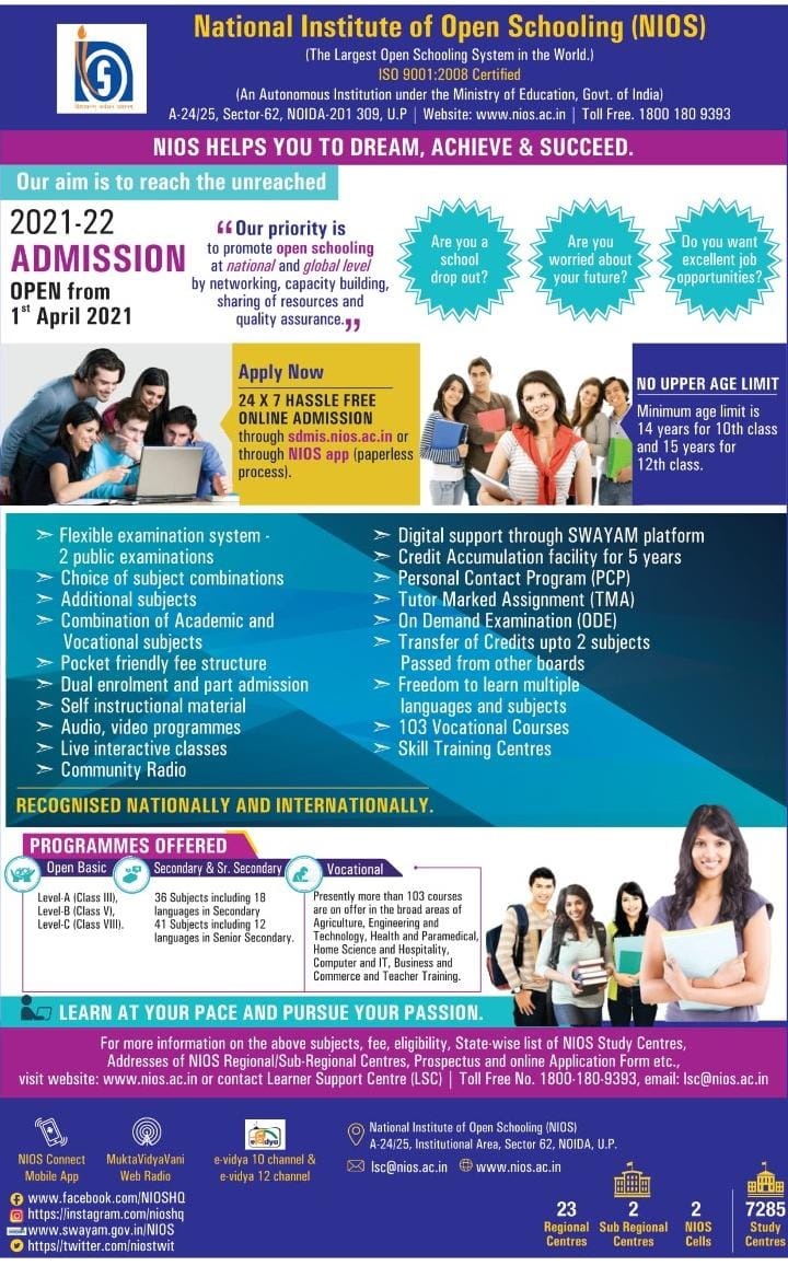 एआईसीटीई-अनुमोदित संस्थानों में प्रवेश के लिए राष्ट्रीय मुक्त विद्यालयी शिक्षा संस्थान (एनआईओएस) की योग्यताओं को मान्यता/Recognition of National Institute of Open Schooling (NIOS) qualifications for admission in AICTE-approved institutions