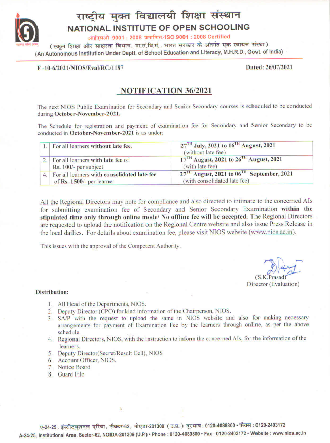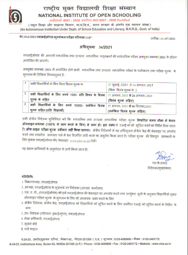 Notification regarding submission of Public exam fee for Sec & Sr Sec for Oct-Nov 2021